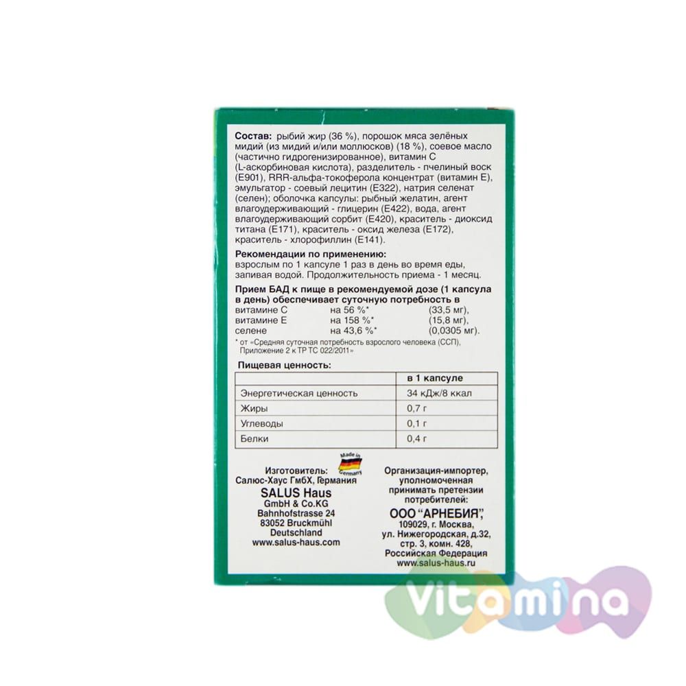 оболочка капсулы: рыбный желатин, агент влагоудерживающий - глицерин (Е422), вода, агент влагоудерживающий сорбит (Е420), краситель - диоксид титана (Е171), краситель - оксид железа (Е172), краситель - хлорофиллин (Е141).