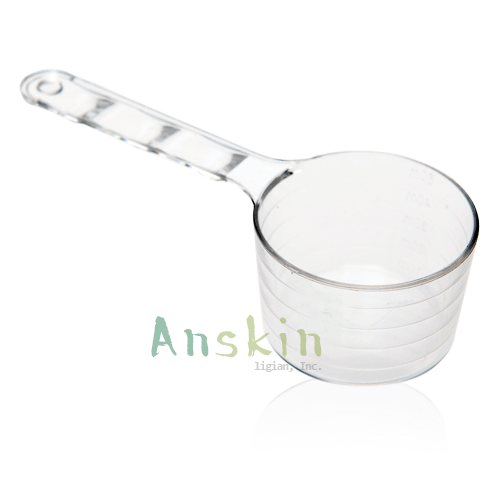 Мерная чашечка для альгинатных масок. Удобный аксессуар изготовлен из качественного пластика в виде прозрачного миниатюрного ковша с длинной ручкой, на боках которого нанесена разметка от 10 до 50 мл.