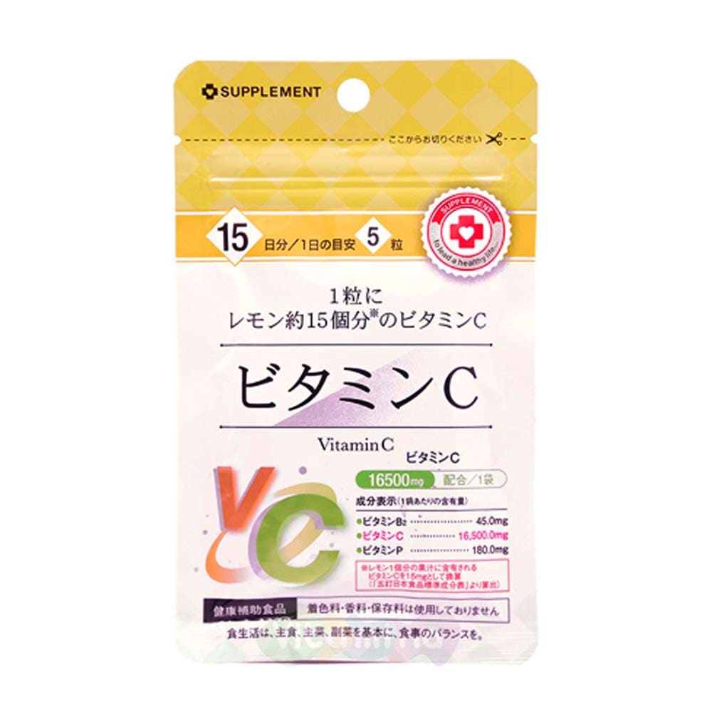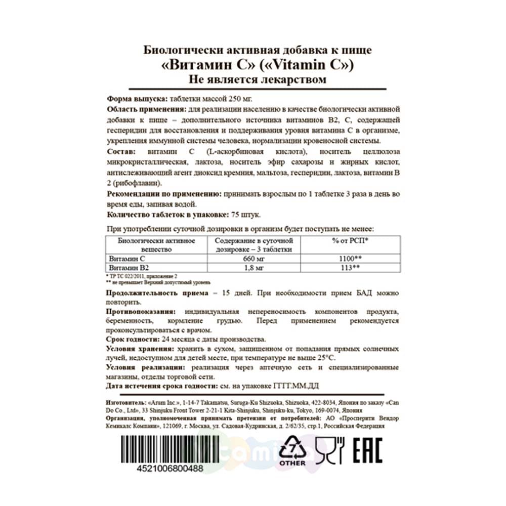 Витамин С (L-аскорбиновая кислота), носитель целлюлоза микрокристаллическая, лактоза, носитель эфир сахарозы и жирных кислот, антислеживающий агент диоксид кремния, мальтоза, гесперидин, лактоза, витамин В2 (рибофлавин).
