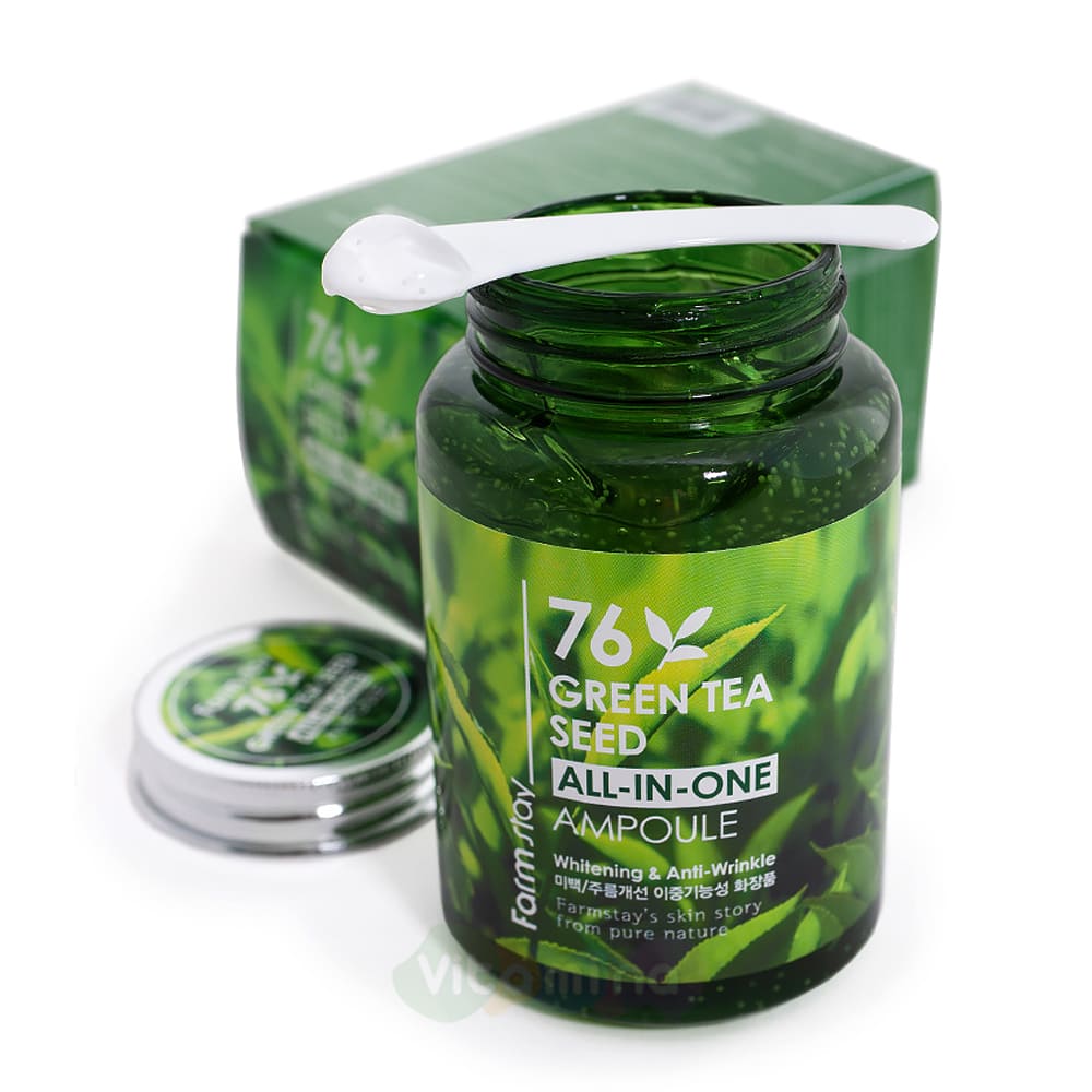 FarmStay 76 Green Tea Seed All-In-One Ampoule — это многофункциональная сыворотка для лица с экстрактом семян зеленого чая. Она активно увлажняет кожу, обогащает её витаминами, заряжает энергией, улучшает цвет лица, придаёт ему матовость и ухоженный вид.