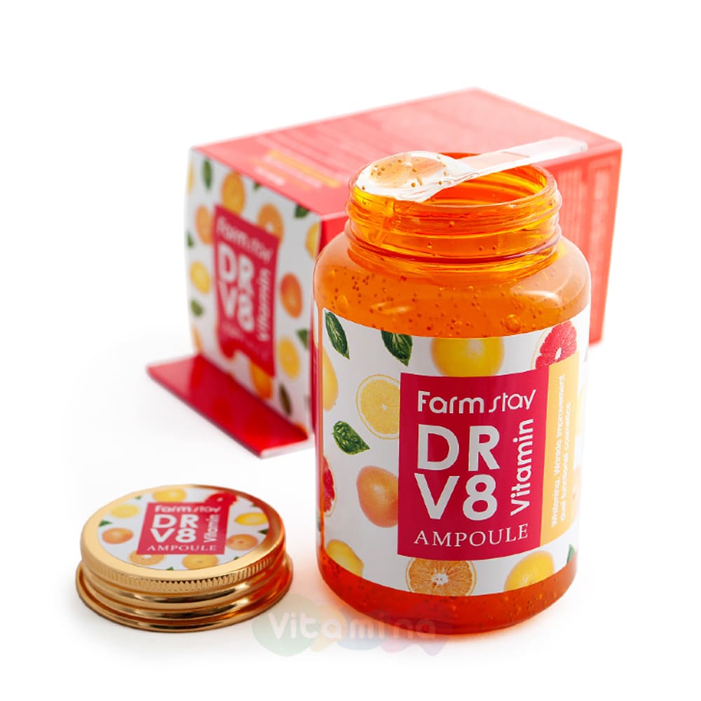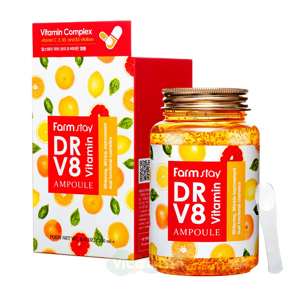 FarmStay Dr-V8 Vitamin Ampoule — это многофункциональная сыворотка для лица с витаминами. Она освежает и тонизирует кожу, оздоравливает её, избавляет от стресса, усталости, напряжения, избыточной жирности и других дерматологических проблем.